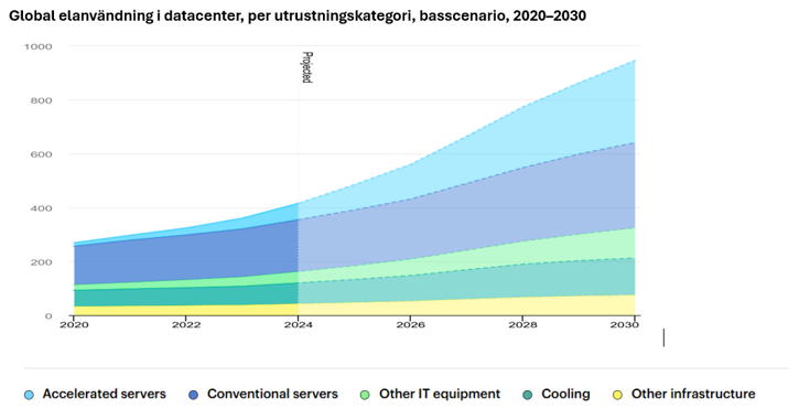 Enligt IEA (International Energy Agency) uppgår den globala elförbrukningen för datacenter i dag till runt 400–500 TWh per år, motsvarande cirka 1,5 % av den globala elanvändningen. Antal datacenter ökar globalt i cirka 15 till 20% per år. Även storleken på datacenter växer med 10 gånger årligen. IEA:s basprognos visar att efterfrågan kan nästan fördubblas till 2030, drivet av AI-modeller, accelererade servrar och ökad GPU-densitet.