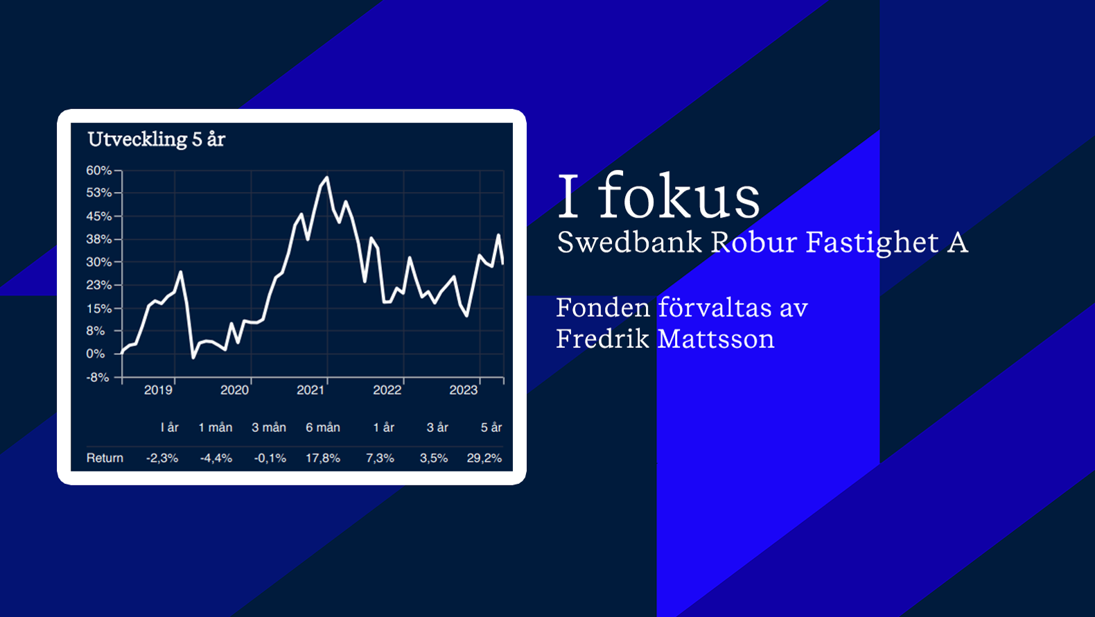 Mot bakgrund av det har vi tittat närmare på fonden Swedbank Robur Fastighet A. som är en aktivt förvaltad aktiefond som huvudsakligen placerar i bolag inriktade mot fastighetsbranschen såsom fastighetsbolag, mäklare eller byggbolag i Sverige och globalt. I normalfallet placeras 25 procent i Sverige och 75 procent globalt. Fonden har även möjlighet att placera i andra bolag som till övervägande del har reala tillgångar, såsom skogs- och kraftbolag.