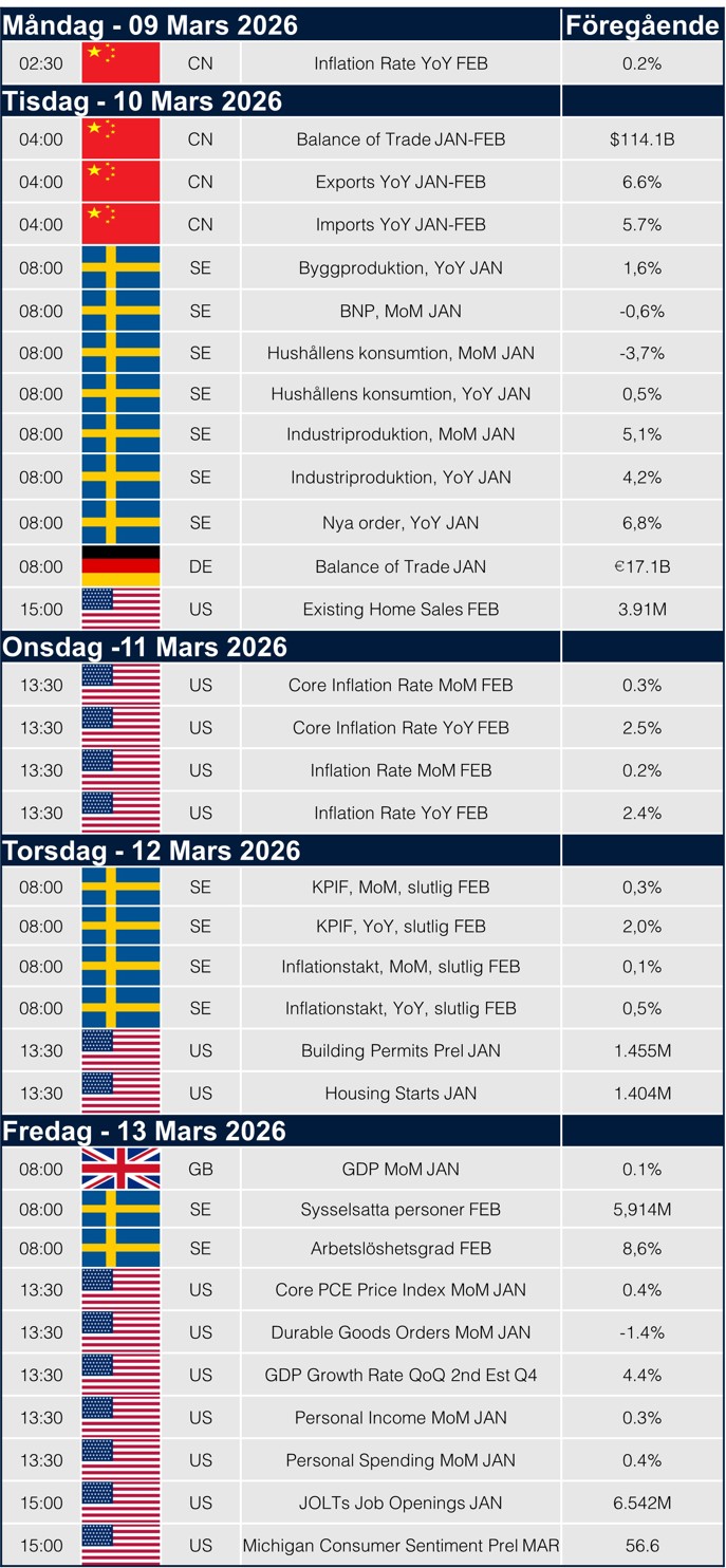 Veckan dominerades helt av den snabba och allvarliga eskaleringen i Mellanöstern, där konflikten mellan USA, Israel och Iran utvecklades från ett regionalt säkerhetshot till en global marknadsfråga med direkt påverkan på energi, inflation, transporter och riskaptit. Det som först tolkades som en kraftig men möjligen kortvarig upptrappning kom snabbt att omvärderas när Iran i praktiken stängde Hormuzsundet, hotade att sätta eld på fartyg som försökte passera och samtidigt genomförde eller anklagades för attacker mot mål i flera länder i regionen. Närmare 20 procent av världens olje- och LNG-flöden passerar genom sundet, vilket gjorde att marknaden omedelbart började prisa in inte bara högre energipriser utan också risken för ett mer utdraget utbudsbortfall.
