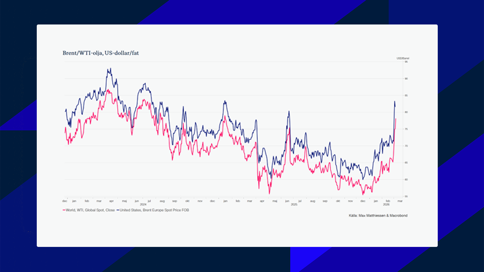 I USA var bilden mer tudelad. På makrosidan kom starkare siffror från tjänstesektorn, där ISM tjänste-PMI steg till den högsta nivån sedan 2022, och arbetsmarknaden visade fortsatt motståndskraft. Det talar för att amerikansk ekonomi går in i denna fas från en starkare position än Europa. Men även där finns risker. Högre oljepriser slår snabbt på amerikanska hushåll via bensinpriser, och om energichocken biter sig fast kan det påverka både inflation och sentiment. Samtidigt skapade Trumpregeringens parallella tullbesked ytterligare osäkerhet, särskilt när marknaden redan försöker avgöra om den geopolitiska chocken är tillfällig eller början på en längre period av högre råvarupriser och störda handelsflöden.
