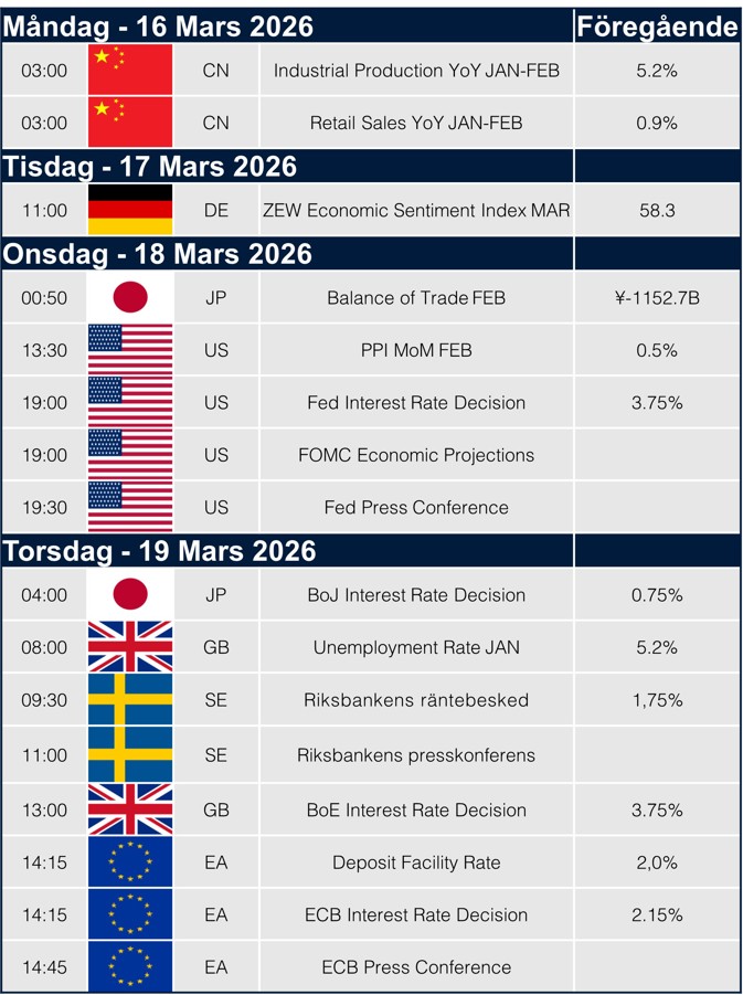 Nästa vecka riktas fullt fokus mot centralbankerna. Fed lämnar räntebesked på onsdag tillsammans med nya prognoser och presskonferens från Powell, medan torsdagen blir särskilt tung med räntebesked från Riksbanken, Bank of England, ECB och Bank of Japan. Därutöver får vi amerikansk PPI, tysk ZEW och kinesisk aktivitetsdata, vilket gör veckan viktig för hur marknaden väger inflationsrisker mot växande geopolitisk osäkerhet.