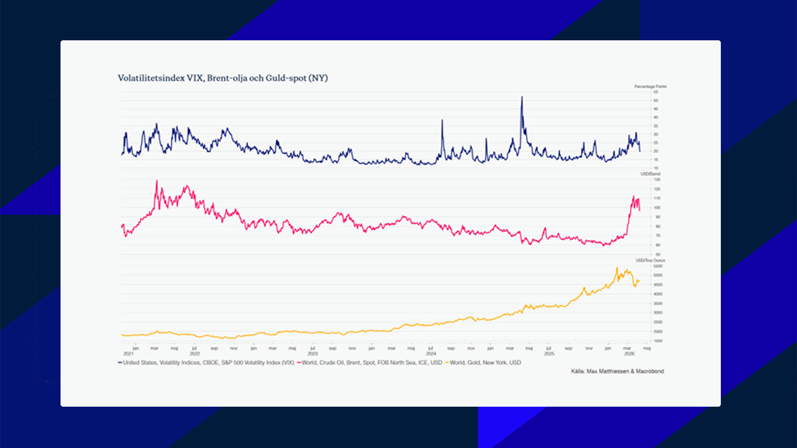 Makrodata spelar fortsatt en sekundär roll i detta läge. I USA syns tecken på avmattning i tjänstesektorn, samtidigt som arbetsmarknaden visar viss styrka. I Sverige överraskade inflationen på nedsidan, vilket indikerar att inhemskt pristryck är begränsat trots global oro. I Kina fortsätter bilden att vara blandad, med svagare tjänstesektor men relativt stabil industridata. Sammantaget förstärker detta bilden av en global ekonomi som går in i en mer osäker fas, där geopolitik snarare än konjunkturdata sätter riktningen.