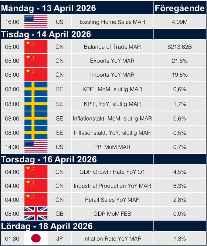 Nästa vecka får vi slutlig inflationsdata i Sverige och USA, där KPIF och PPI ger viktiga signaler om det underliggande pristrycket. Samtidigt får vi kinesisk handels- och tillväxtdata samt brittisk BNP, vilket ger en bredare bild av den globala konjunkturen i ett fortsatt geopolitiskt osäkert läge.