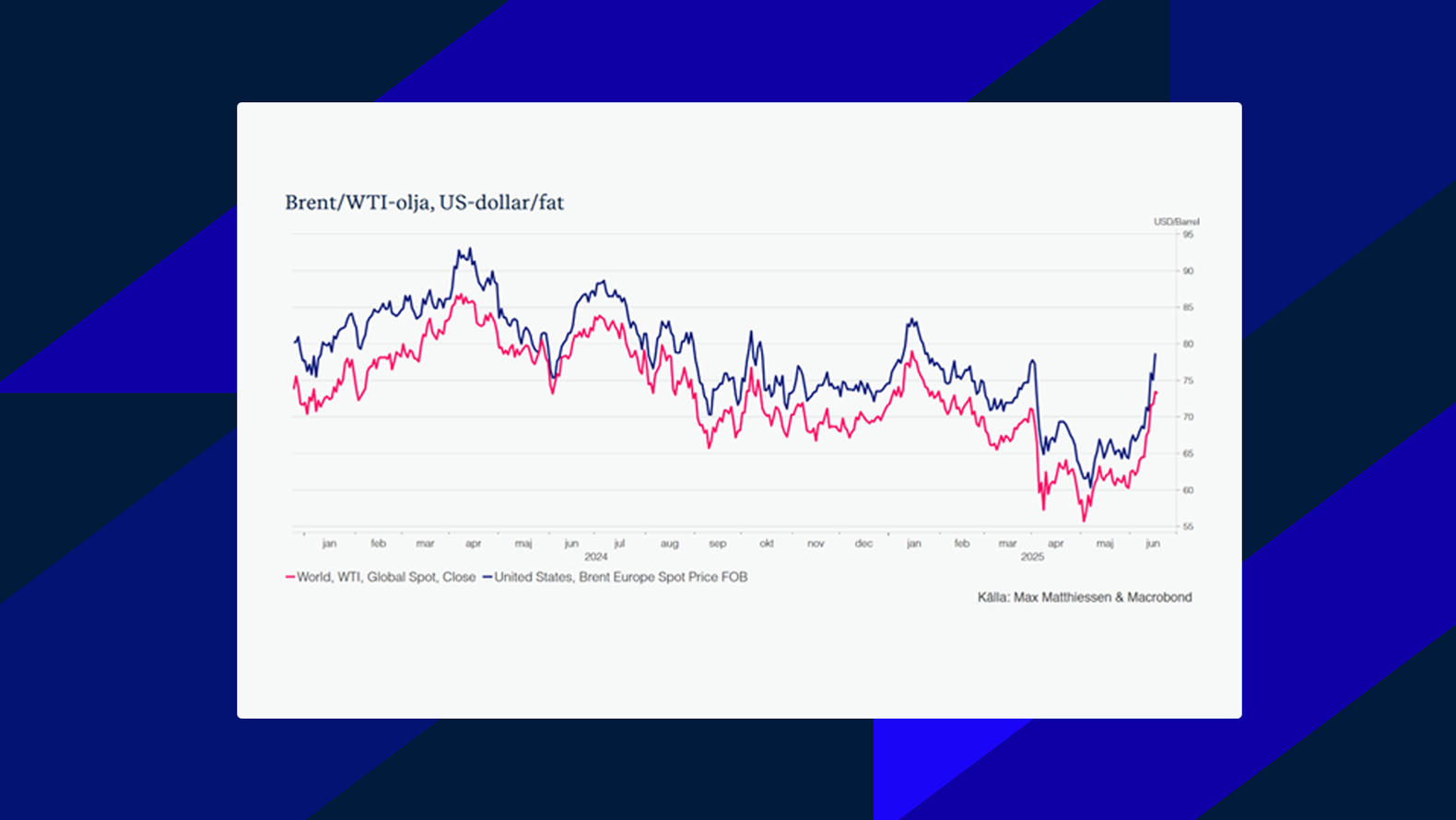 Den mest uppmärksammade händelsen under veckan var dock det eskalerande säkerhetsläget i Mellanöstern. I mitten av juni genomförde Israel flyganfall riktade mot iranska kärntekniska anläggningar, vilket markerade en tydlig upptrappning i den redan spända relationen mellan länderna. Attacken har lett till ökad oro på marknaderna, med ett kraftigt uppsving i oljepriserna som följd. Brent- och WTI-olja har stigit med över 17 % respektive 19 % hittills i juni, vilket signalerar att investerare prissätter en högre geopolitisk riskpremie. Samtidigt har tillgångar som amerikansk dollar, guld, japansk yen och schweizerfranc stärkts, vilket ytterligare speglar den globala riskaversionen.