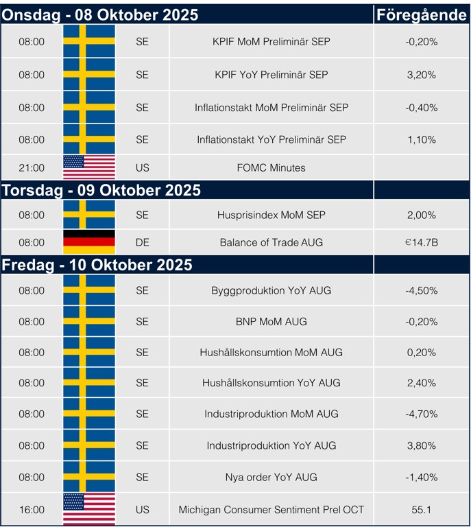 Nästa veckas makro bjuder på preliminär inflationsstatistik (KPIF och KPI) på onsdagen, följt av BNP, hushållskonsumtion och industriproduktion på fredagen. Samtidigt blir FOMC-minutes i USA viktiga för marknadens tolkning av Fed:s senaste räntesänkning.