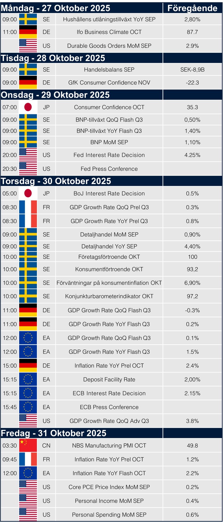 Nästa vecka domineras av centralbanksbesked, både Fed och ECB lämnar räntebeslut som väntas bekräfta den mjukare policylinjen inför årets slut. Utöver detta publiceras BNP-siffror för Q3 från flera större ekonomier, vilket ger en tydligare bild av det globala tillväxtläget.