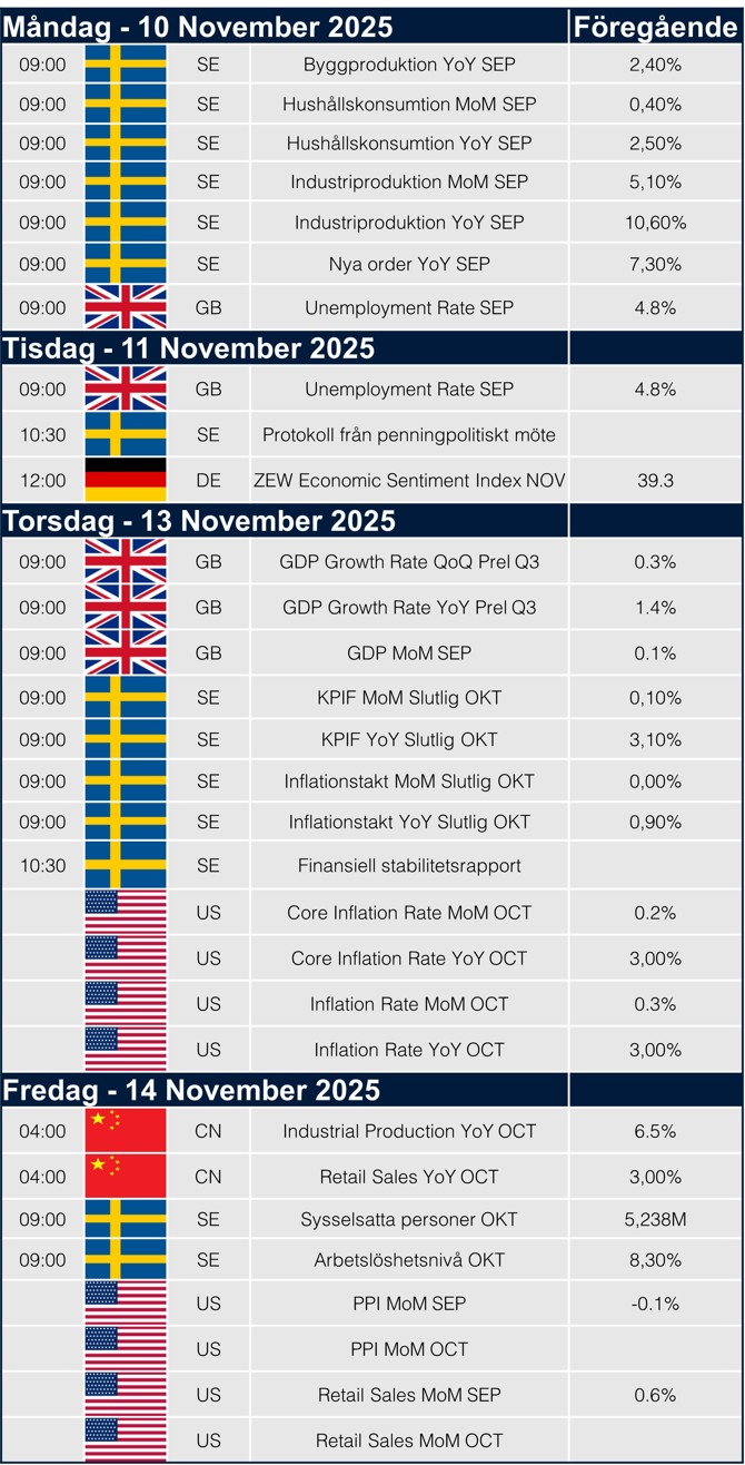 Nästa veckas makro ligger fokus på konjunktursiffror. I Sverige får vi en bred svit av data för september/oktober - bygg, industriproduktion, hushållskonsumtion, nya order, sysselsättning och arbetslöshet, samtidigt som Storbritannien rapporterar BNP för Q3 och USA publicerar ny inflations- och detaljhandelsstatistik, vilket blir viktigt för tolkningen av Fed:s fortsatta räntesänkningscykel.