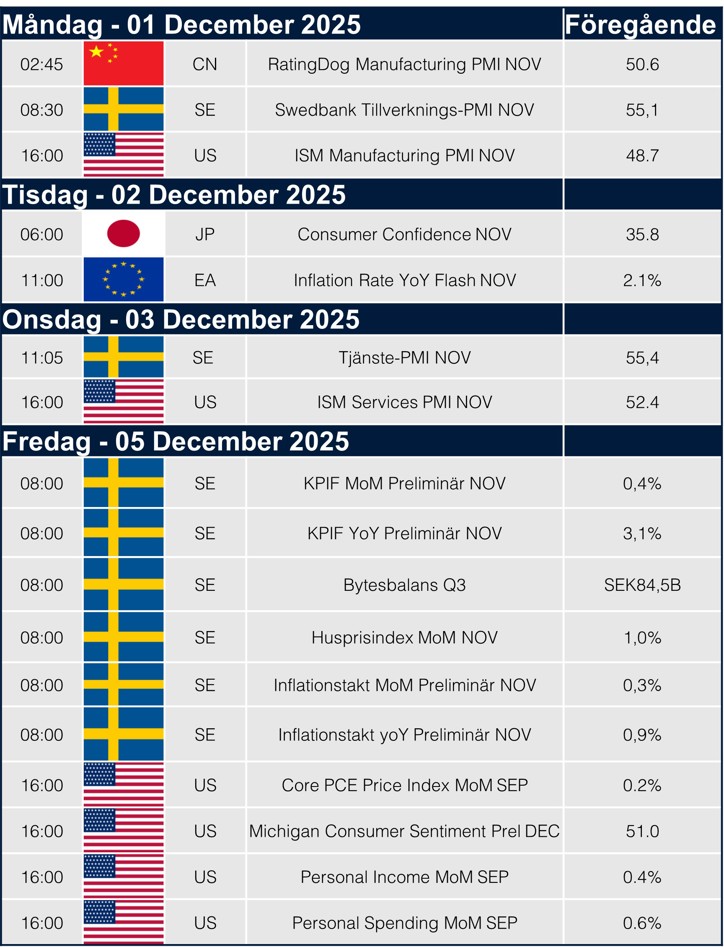Nästa veckas fokus skiftar mot inflationsdata och sentimentindikatorer. Veckan inleds med kinesiskt industri-PMI och svenskt tillverknings-PMI, följt av amerikanskt ISM Manufacturing som ger en ny temperaturmätare på den globala industrikonjunkturen. Under veckan får vi dessutom eurozonens preliminära inflationssiffra, japanskt konsumentförtroende och nya amerikanska tjänste-PMI-data, centrala datapunkter för att bedöma efterfrågeläget. Veckan avslutas med en tung makromorgon på fredag när Sverige publicerar KPIF, KPI, husprisindex och bytesbalans, samtidigt som USA släpper PCE-inflationen, hushållssentiment samt inkomster och konsumtion.