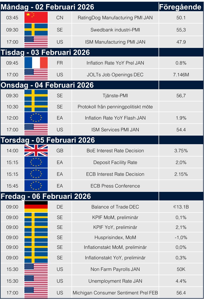 I Europa visade Tyskland fortsatt svagt momentum. IFO-index låg kvar på låga nivåer och signalerar att den tyska ekonomin inleder året utan tydlig dragkraft, även om vissa förbättringar noterades inom industrin och handeln. Frankrikes BNP ökade i linje med förväntningarna under fjärde kvartalet, medan inflationen fortsatte att falla i flera delar av euroområdet, vilket bidrog till ett något mer balanserat inflationsläge inför kommande centralbanksbesked.