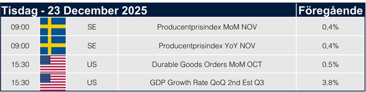 I Europa var bilden splittrad. Tysk industriproduktion överraskade positivt, men PMI-data visade att tillverkningssektorn fortsatt befinner sig i tydlig motvind, särskilt i Tyskland, medan tjänstesektorn fortsatt bidrar till att stabilisera tillväxten. Eurozonens samlade PMI föll i december och indikerar ett svagt avslut på året, med avmattande momentum men fortsatt relativt okej tjänsteaktivitet. Samtidigt tyngdes europeiska börser av nedgångar i försvarssektorn i takt med att förhoppningar om ett fredsavtal i Ukraina stärktes.