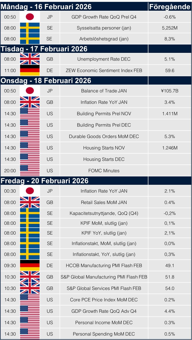 I Asien överraskade Japans bytesbalans kraftigt på uppsidan i december, med ett överskott som var långt större än väntat. Samtidigt steg japanska producentpriser i linje med prognoserna, vilket indikerar ett fortsatt men kontrollerat kostnadstryck i ekonomin. I Kina dämpades inflationstakten mer än väntat i januari, med svag utveckling i livsmedelspriser och en nedväxling i kärninflationen, vilket understryker den fortsatt tröga inhemska efterfrågan.