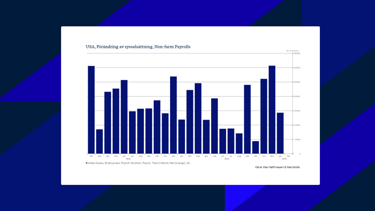 - Nästa vecka avrundas med amerikanska jobbsiffror på fredag eftermiddag – en marknadshändelse med stor betydelse, eftersom Federal Reserve både strävar efter prisstabilitet och full sysselsättning. Förra månaden var sysselsättningstillväxten något lägre än väntat, samtidigt som arbetslösheten sjönk något, medan löneökningarna överraskade på uppsidan. Enligt Bloombergs konsensus väntas 158 000 nya jobb ha skapats, och arbetslösheten förväntas ligga kvar på 4,0 procent.