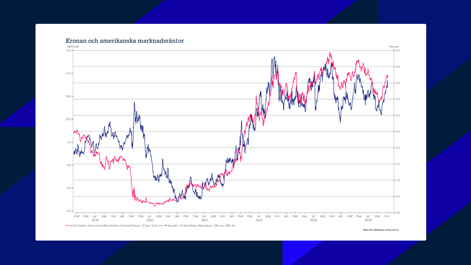 De högre amerikanska marknadsräntorna och trycket uppåt på dollarn har skapat motvind för den svenska kronan, även om vi såg en viss rekyl under torsdagen. Riksbanken sänkte dock, som väntat både utifrån prognoser och marknadens prissättning, räntan med 0,50 procentenheter till 2,75 procent i torsdags. Riksbanken presenterade inga nya prognoser, vilket kommer först vid mötet i december. I pressmeddelandet antyddes fler kommande sänkningar i december och under första halvåret, i linje med kommunikationen från september. Riksbanken betonade även att den ekonomiska utvecklingen för närvarande är svårbedömd, särskilt internationellt och inte minst efter det amerikanska valet. I torsdags publicerades även snabb-KPI för oktober, som visade ett något högre utfall än väntat. Inflationstakten för KPIF exklusive energi steg från 2,0 till 2,1 procent.